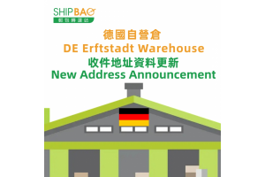 即日起德國自營倉收貨地址已更新,已填寫舊地址的貨物不受影響,Shipbao仍會處理轉寄。及後請填寫更新地址,否則有機會影響貨物轉運。