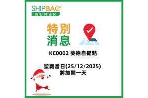 亲爱的Shipbaoer, 为方便客人取件, 圣诞当日(25/12) KC0002 葵德自提点 将加开一天 地址:葵芳葵德街15-33 号葵德工业大厦二期1楼AE室 (葵芳地铁站C出口) 营业时间: 11:00-19:00 如有任何查询, 请联络Shipbao客服, 谢谢。 Shipbao团队