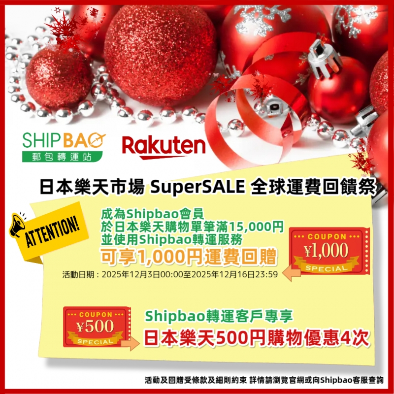 - 優惠只適用於Shipbao日本東京倉或/及日本大阪倉之日本樂天集運訂單, 合併日本非樂天訂單或合併其他國家集運訂單均不可享優惠