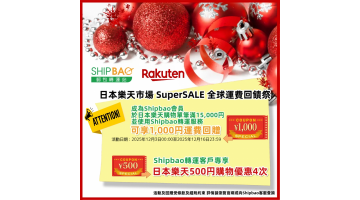 活動期間註冊 成為Shipbao會員, 於日本樂天購物 單筆滿15,000円 並使用Shipbao日本倉轉運服務, 可享1,000円運費回贈