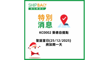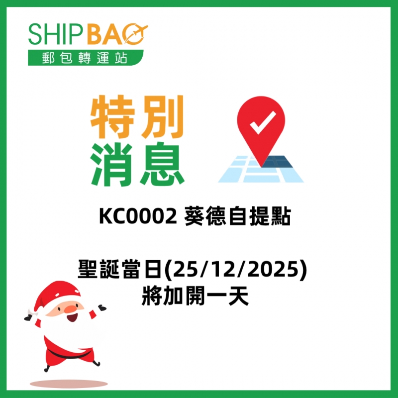 亲爱的Shipbaoer, 为方便客人取件, 圣诞当日(25/12) KC0002 葵德自提点 将加开一天 地址:葵芳葵德街15-33 号葵德工业大厦二期1楼AE室 (葵芳地铁站C出口) 营业时间: 11:00-19:00 如有任何查询, 请联络Shipbao客服, 谢谢。 Shipbao团队
